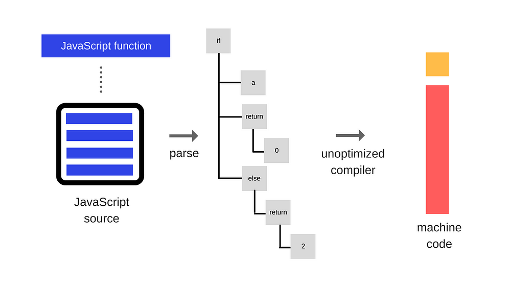 Ở bên trái, chúng ta có Javascript source, bao gồm các hàm. Đầu tiên thì nó cần phải được parse (phân tích cú pháp) để chuyển tất cả string sang token và sinh ra Abstract Syntax Tree (AST - Cây cú pháp trừu tượng, chúng ta sẽ có một bài viết về nó sau). Cây AST là đại diện biểu thị logic của chương trình JS trong bộ nhớ. Một khi nó được sinh ra, V8 sẽ đi thẳng đến mã máy. Về cơ bản thì bạn sẽ duyệt qua cây đó, tạo ra mã máy và hàm của bạn đã được biên dịch. Không có tiến trình nào cố gắng tăng tốc nó.