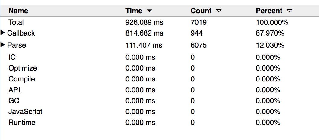 Timeline (Performance panel) > Bottom-Up/Call Tree/Event Log will let us drill into the amount of time spent in Parse/Compile. For a more complete picture (like the time spent in Parsing, Preparsing or Lazy Compiling), we can turn on V8’s Runtime Call Stats. In Canary, this will be in Experiments > V8 Runtime Call Stats on Timeline.